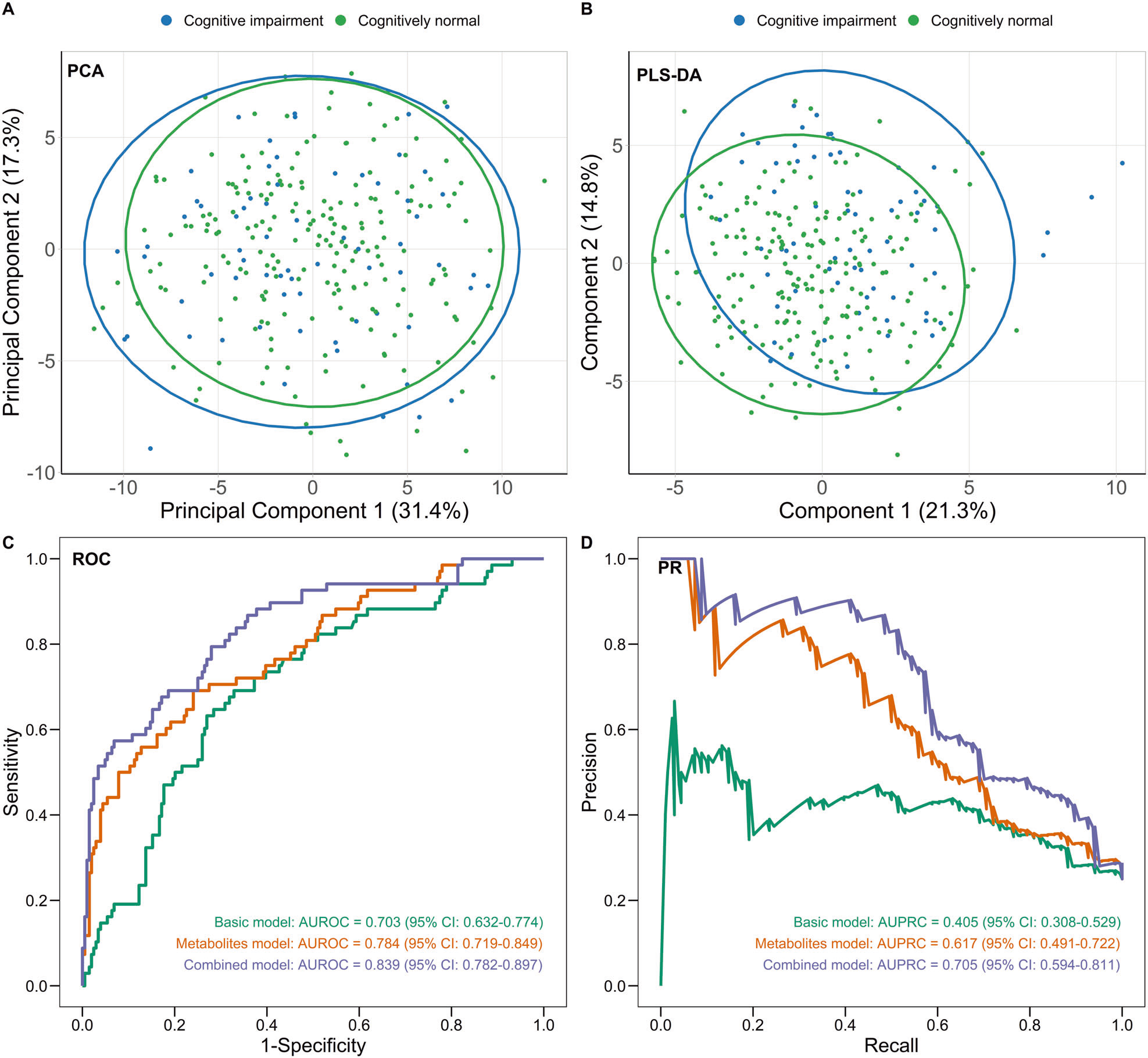 通過Lasso回歸篩選出的13種代謝物標志物(如IDL顆粒數、乙酸、丙酮等)顯著提升了認知功能障礙的預測能力。與傳統風險因素模型相比,結合代謝物標志物的模型在預測新發認知功能障礙時,AUROC從0.703提升至0.839(P<0.001),AUPRC從0.405提升至0.705(P<0.001)。