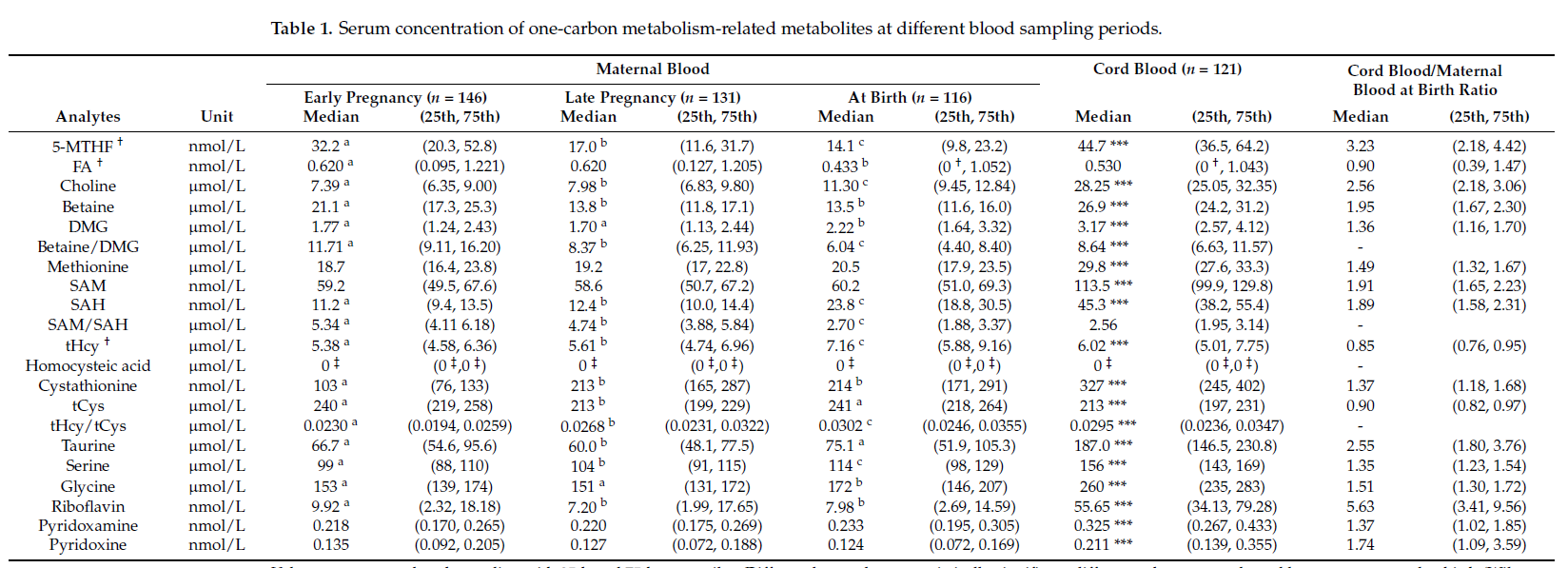 2024年6月,日本女子營(yíng)養(yǎng)大學(xué)和順天堂大學(xué)研究人員在期刊《Nutrients》上發(fā)表了題為“Longitudinal Analysis of One-Carbon Metabolism-Related Metabolites in Maternal and Cord Blood of Japanese Pregnant Women”的科學(xué)論文,揭示了孕期OCM的動(dòng)態(tài)變化,包括葉酸循環(huán)、膽堿代謝途徑、蛋氨酸循環(huán)和轉(zhuǎn)硫途徑的相互作用。發(fā)現(xiàn)孕婦5-MTHF和甜菜堿水平可能影響轉(zhuǎn)硫通量,tHcy/tCys比值是OCM狀態(tài)的潛在更敏感指標(biāo),原文鏈接:https://doi.org/10.3390/nu16111765。