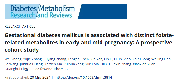 2024年3月,首都醫科大學附屬北京婦產醫院李光輝教授團隊在期刊《Diabetes/Metabolism Research and Reviews》上發表了題為“Gestational diabetes mellitus is associated with distinct folate-related metabolites in early and mid-pregnancy: A prospective cohort study”的科學論文,評估中國人群中循環葉酸代謝物濃度、孕期補充FA攝入量、MTHFR和MTRR基因多態性與GDM之間的聯系,原文鏈接:https://doi.org/10.1002/dmrr.3814。