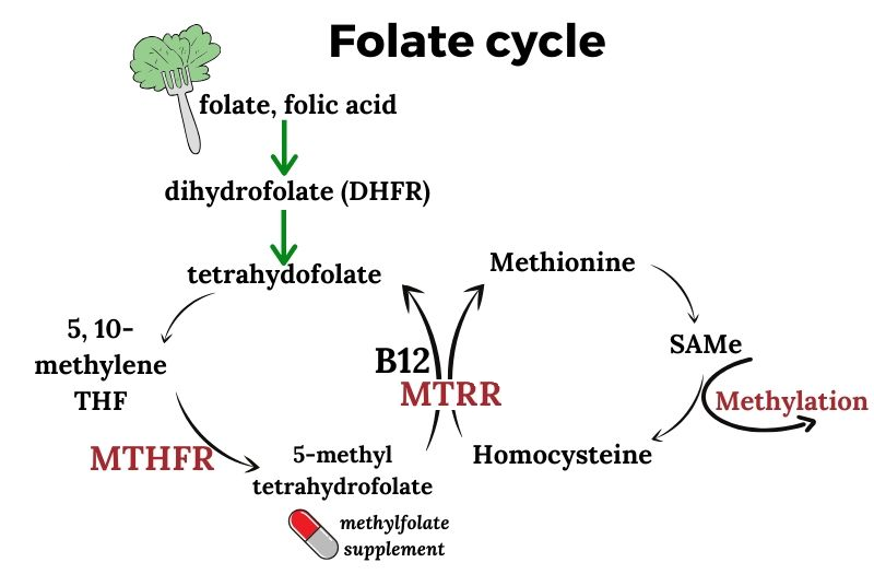 葉酸-蛋氨酸循環:葉酸(Folic Acid,FA)也就是VB9,本身沒有生理功能,在體內二氫葉酸還原酶(DHFR)的作用下轉變成二氫葉酸(DHF)及四氫葉酸(THF),隨后THF轉化為5,10-亞甲基四氫葉酸 (5,10-CH2-THF)。最關鍵的一步是在亞甲基四氫葉酸還原酶(MTHFR)的作用下轉化為5-甲基四氫葉酸 (5-MTHF),它是人體中葉酸的主要活性形式,可以將Hcy轉化為Met,而蛋氨酸循環中的關鍵酶是蛋氨酸合成酶還原酶(MTRR)。