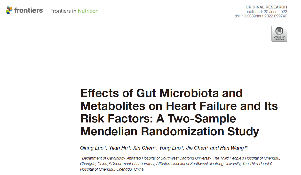 由于傳統的觀察性研究存在反向因果關系和混雜因素的局限性,本研究采用孟德爾隨機化方法,利用遺傳變異作為工具變量,揭示腸道菌群及其代謝產物對心力衰竭及其風險因素的影響。文章于2022年7月發表在《Frontiers in Nutrition》期刊上,標題為 “Effects of Gut Microbiota and Metabolites on Heart Failure and Its Risk Factors: A Two-Sample Mendelian Randomization Study”,原文鏈接:https://doi.org/10.3389/fnut.2022.899746。