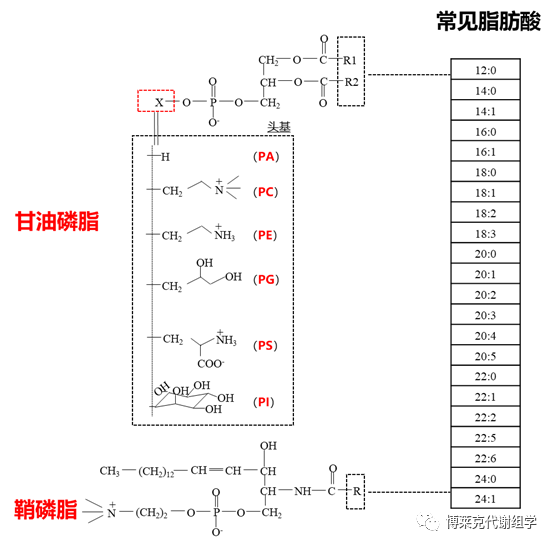 根據組成主要分為甘油磷脂(Glycerophospholipid,GP)和鞘磷脂兩類,鞘磷脂以神經鞘磷脂(Sphingomyelin,SM)為主。甘油磷脂是以甘油為基本骨架,甘油的兩個羥基(sn-1位和sn-2位)被脂肪酸酯化形成非極性酰基鏈,sn-3位羥基被磷酸酯化為磷脂酸(Phosphatidic acid,PA),磷脂酸的羥基再被膽堿、乙醇胺、絲氨酸或肌醇等取代構成磷脂的極性頭部,從而形成PC,PG,PG,PI和PS等。甘油磷脂在磷脂酶A的作用下水解sn-1位和sn-2位的酰基鏈可形成一系列的溶血磷脂(Lyso-glycerophospholipid)。鞘磷脂的基本骨架是由鞘氨醇或二羥鞘氨醇的氨基通過酰胺鍵與長鏈脂肪酸結合形成的神經酰胺,神經酰胺的羥基與磷酸膽堿結合形成含鞘氨醇或二氫鞘氨醇的SM。