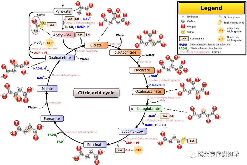 三羧酸循環(tricarboxylic acid (TCA) cycle or Krebs’ cycle)又稱檸檬酸循環,在細胞的線粒體中進行,在有氧條件下葡萄糖經過分解代謝形成丙酮酸后,丙酮酸通過三羧酸循環進行脫羧和脫氫反應:羧基形成CO2,氫原子則隨著載體(NAD+、FAD)進入電子傳遞鏈經過氧化磷酸化作用,形成水分子并將釋放出的能量合成ATP。