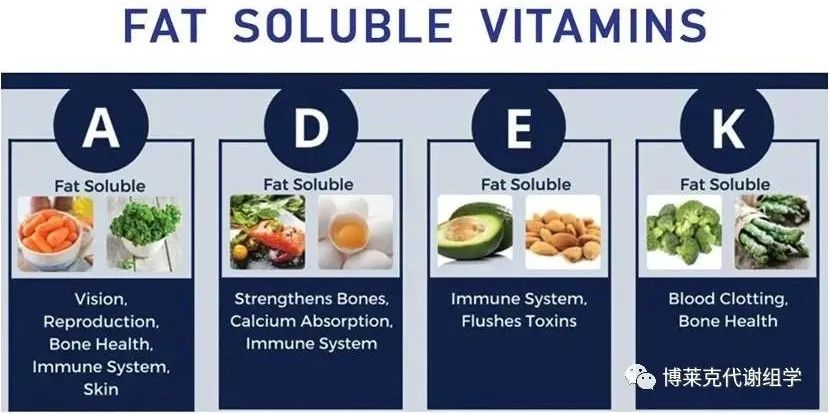維生素A(視黃醇、視黃醛、視黃酸等)對視力、生長發育、細胞分裂、繁殖和免疫非常重要。維生素D的主要功用是促進小腸粘膜細胞對鈣和磷的吸收,能促進骨骼生長、調節細胞生長分化和調節免疫功能。維生素E對視力、生殖、大腦和皮膚健康至關重要,此外還具有抗氧化功能。維生素K參與凝血和骨骼形成。