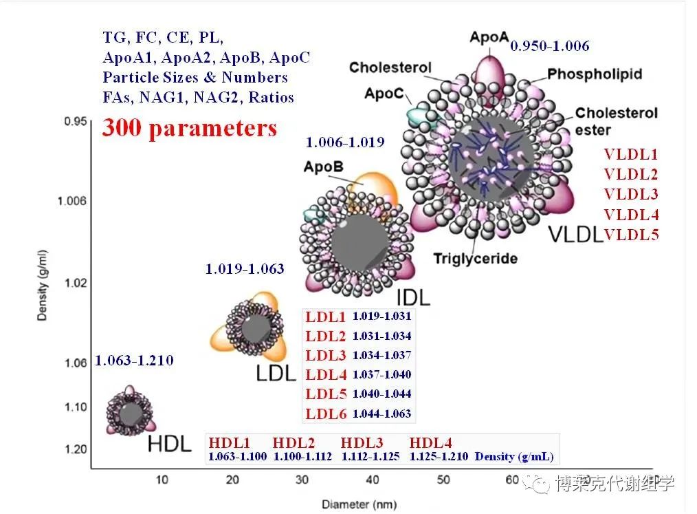 脂蛋白根據(jù)密度大小可分為:乳糜微粒(CM)、極低密度脂蛋白(VLDL)、中密度脂蛋白(IDL)、低密度脂蛋白(LDL)和高密度脂蛋白(HDL)。其中VLDL可分為5個(gè)亞類(lèi)(VLDL 1-5),LDL可分為6個(gè)亞類(lèi)(LDL 1-6),HDL可分為4個(gè)亞類(lèi)(HDL 1-4),各亞類(lèi)的表達(dá)與功能不盡一致。